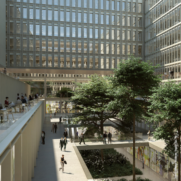Les 5 niveaux d’infrastructure, dédiés aux places de stationnement et la superstructure sont réalisés en béton bas carbone. Les espaces de bureaux sont répartis sur 8 niveaux et l’hôtel sur 11 niveaux.